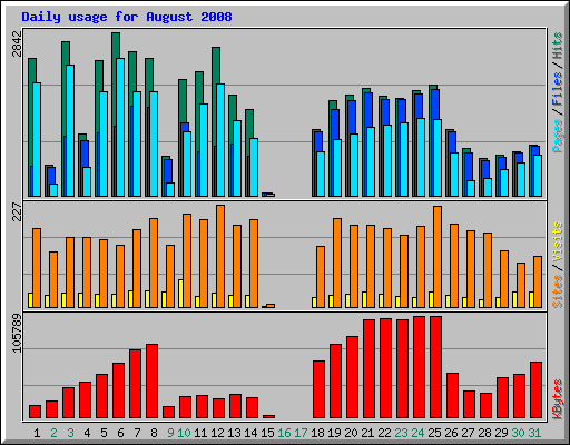 Day | Hits | Files | Pages | Visits | Sites | KBytes | ||||||